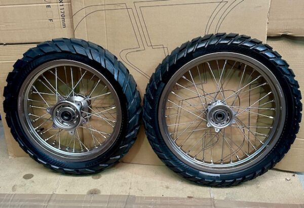 SURRON STORM BEE 17 19 ROAD WHEELS SET – Factory original OEM road wheel set for the Surron Storm Bee. Finished in Anthracite Gold with stainless spokes. Complete with tyres.